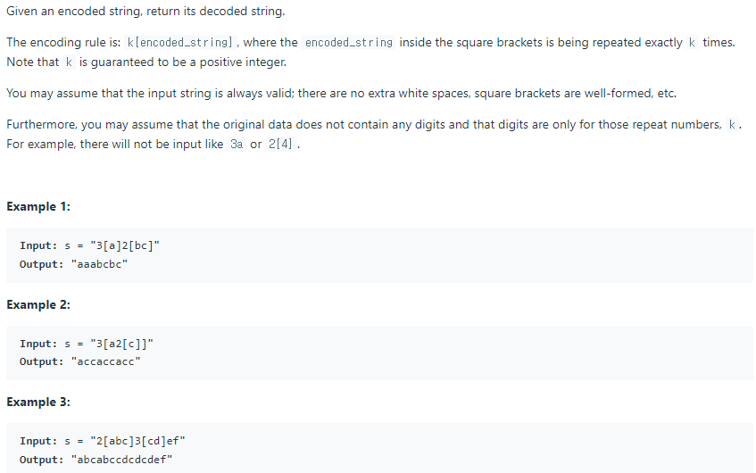 https://leetcode.com/problems/decode-string/ Decode String - LeetCode Level up your coding skills and quickly land a job. This is the best place to expand your knowledge and get prepared for your next interview. leetcode.com 스택 자료구조를 활용하기 적절한 문제이다. 숫자와 문자를 각각의 변수에 저장하고 있다가 여는 괄호를 만나면 스택에 담는다. 닫는 괄호를 만나면 저장해뒀던 숫자와 문자를 꺼낸다. 현재의 문자는 스택에서 꺼낸 숫자대로 반복해주고 스택에서 꺼낸 이전의 문자는 반복 없이 스트링 변수에 저장해준다. 주의해야 할 점은 ..