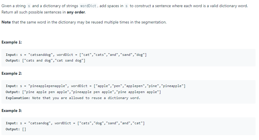 다른 점은 첫번재 문제는 문자열 s를 wordDict에서 찾을 수 있는지 아닌지의 여부를 묻는 것이었고 이 문제는 문자열 s가 wordDict에 있으면 그 단어들을 문자열로 만들어서 가능한 문자열을 모두 리스트로 리턴하는 것이다.